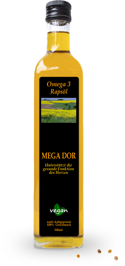 MEGA DOR unterstützt die gesunde Funktion des Herzens mit Omega-3. Unter den pflanzlichen Ölen und Fetten ist unser Rapsöl besonders hervorzuheben. Das Öl hat einen niedrigen Gehalt an gesättigten Fettsäuren und einen hohen Anteil an einfach ungesättigten Fettsäuren. Darüber hinaus hat Rapsöl ein ausgewogenes Verhältnis an den essentiellen Fettsäuren der omega-3 und der omega-6 Reihe: